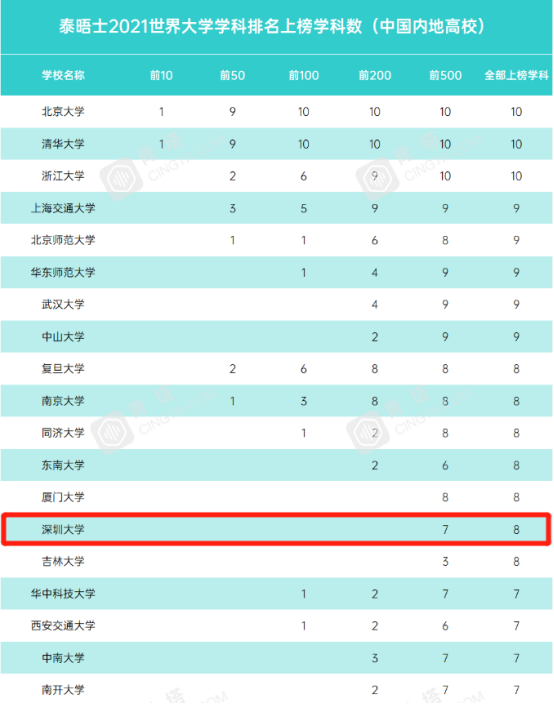 According to the statistics of Cingta, this year 91 universities in Mainland China have managed to make it to the list with a total of 468 disciplines. Among them, Peking University, Tsinghua University and Zhejiang University each have 10 ranked subjects, taking the first spot among Mainland Chinese universities; Shanghai Jiao Tong University, Beijing Normal University, East China Normal University, Wuhan University and Sun Yat-sen University each have 9 ranked disciplines. Shenzhen University, along with Fudan University, Nanjing University, Tongji University, Southeast University and Xiamen University, has 8 ranked disciplines each. It is the only local university and “non-double first-class” university that ranks among the top ten in Mainland Chinafor the number of ranked disciplines in theTHEsubject rankings this year.