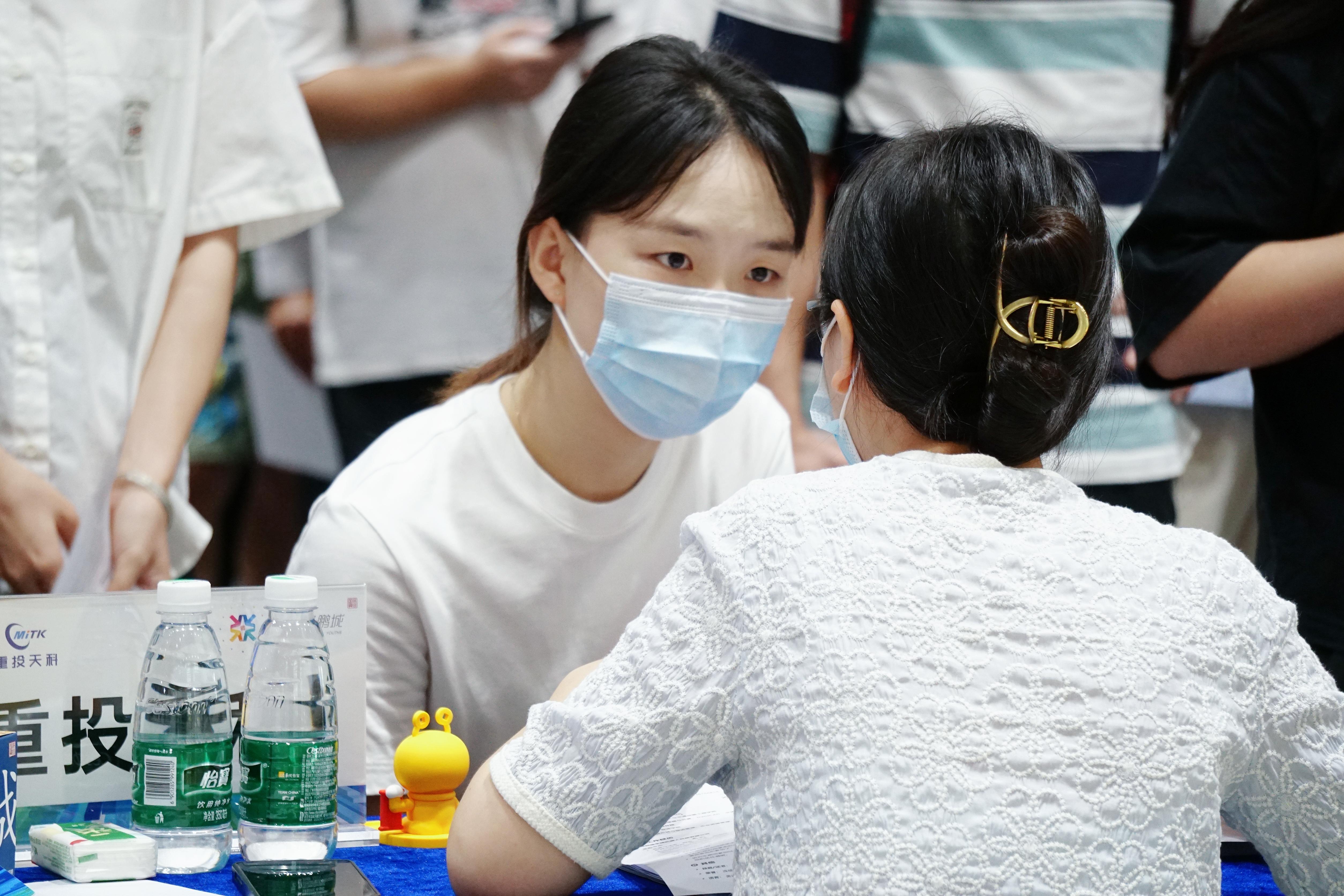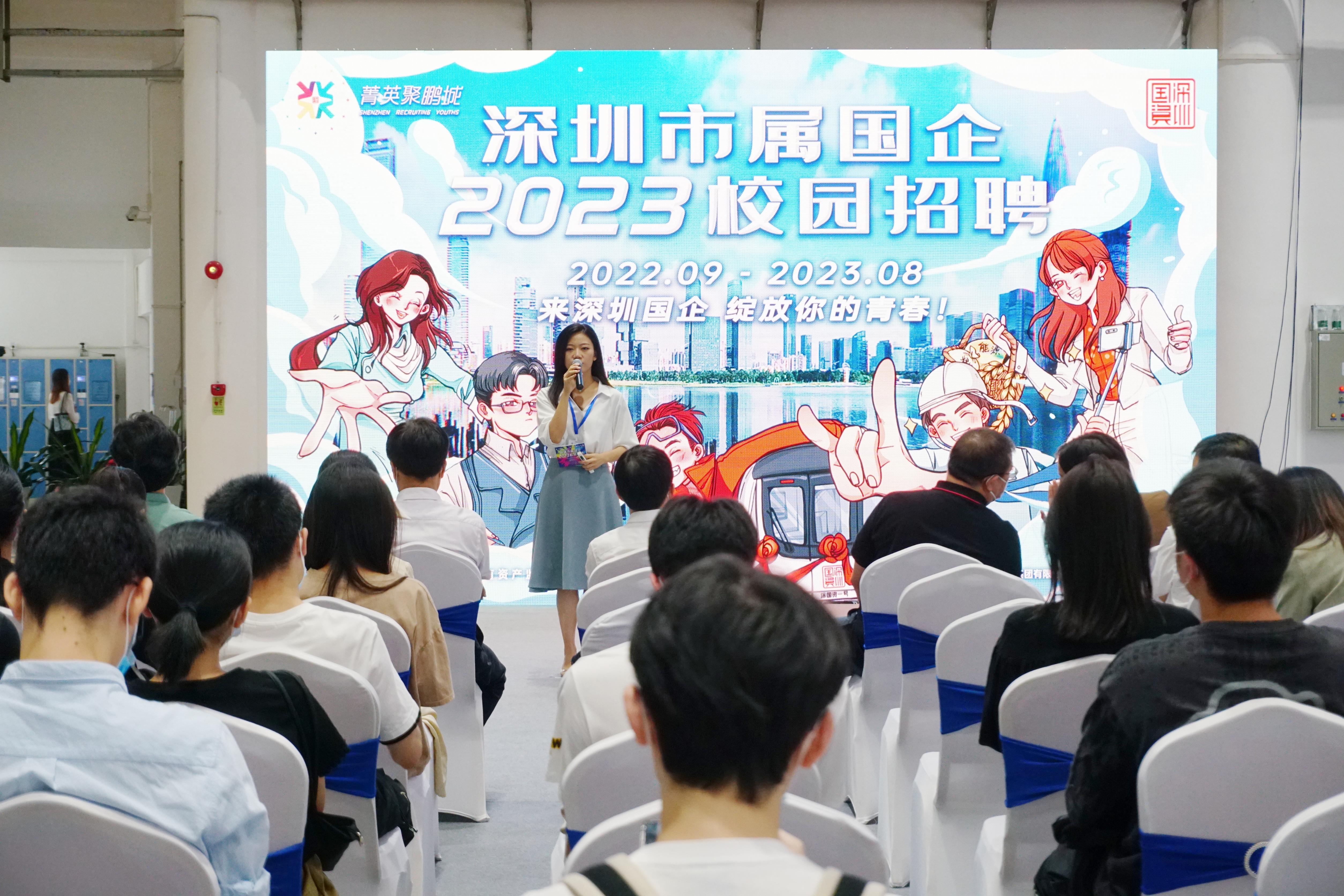 College graduates line up for interviews at a job fair held at the Yuehai campus of Shenzhen University (SZU) on Sunday afternoon. Over 390 companies including 41 local State-owned enterprises (SOEs) attended the job fair, providing over 7,000 job vacancies. The 41 local SOEs including Shum Yip Group Ltd. and Shenzhen Metro Group offered over 570 job positions. This was the first offline job fair organized for the university’s graduates of 2023, according to SZU.