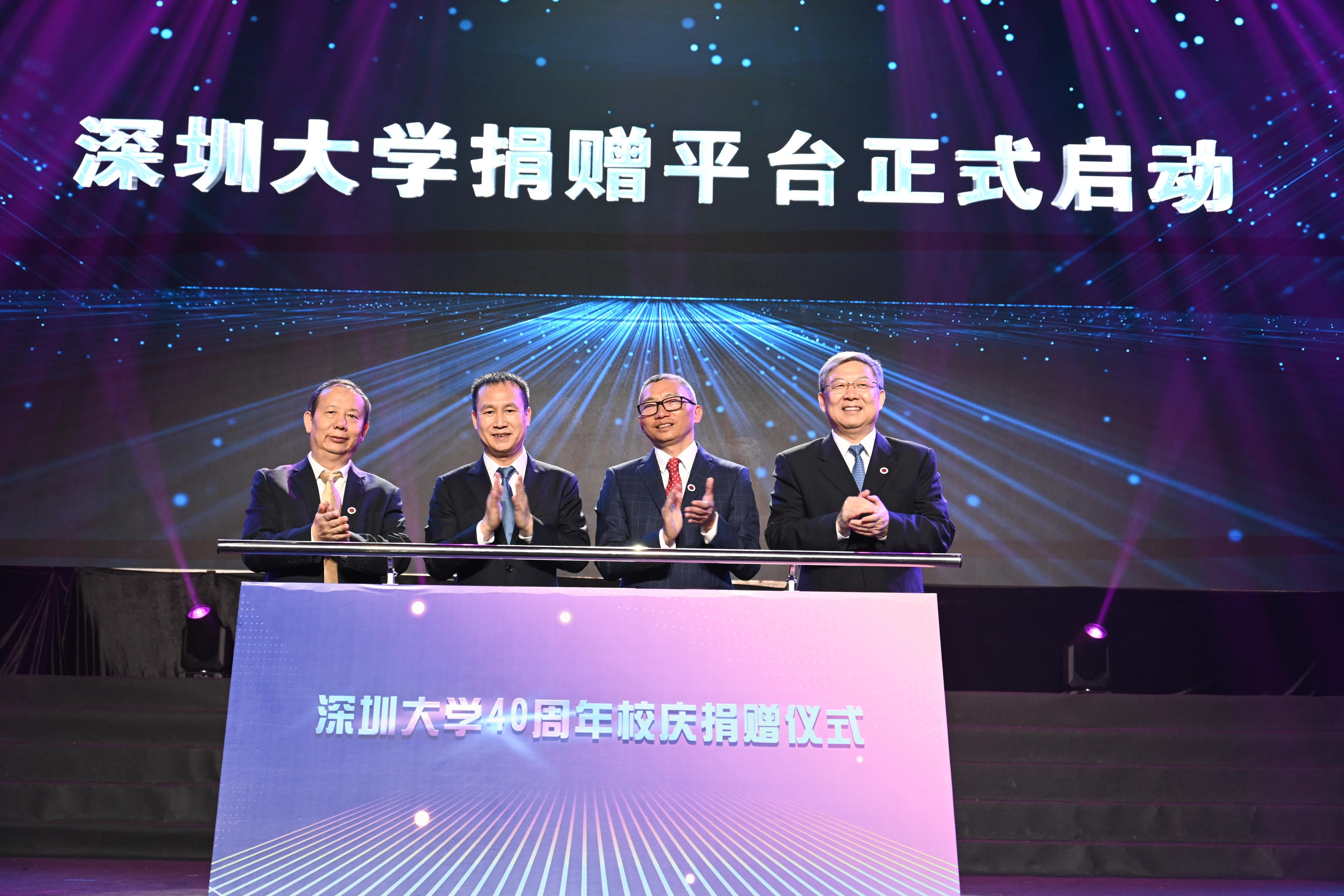 At the end of the donation ceremony, SZU leaders Zeng Pai, Li Qingquan, Mao Junfa and Chen Yidan announce the launch of SZU donation platform. Alumni can access donation projects viahttps://giving.szu.edu.cn/.