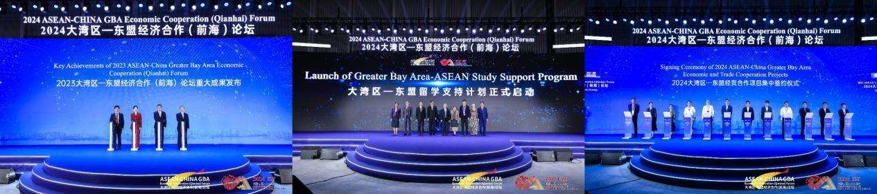 During the forum, Shi Zhongjun, Liang Ke, Mao Junfa, and Wang Lizong, President of the Guangdong High-Tech Industry Chamber,representing the co-organizers,jointly announced the Key Achievements of 2023 ASEAN-China Greater Bay Area Economic Cooperation (Qianhai) Forum and officially launched the GBA-ASEAN Study Support Program with officials from ASEAN consulates. The opening ceremony concluded with the signing of 15 ASEAN cooperation projects, totaling an investment of CNY29.99 billion.