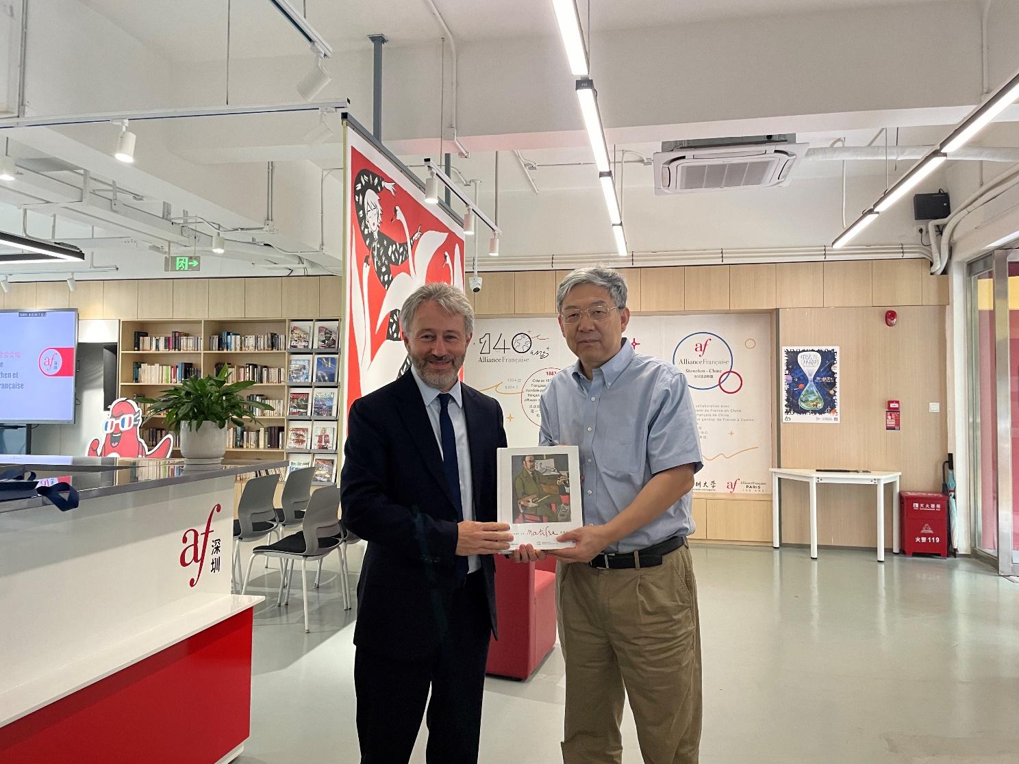 In the afternoon, Li Qingquan, Secretary of the Party Committee of SZU and Academician of the Chinese Academy of Engineering, along with the delegation, visited the 2024 China-France Environment Month Children's Painting Competition Exhibition at the Shenzhen Alliance Française. Li Qingquan welcomed the delegation and acknowledged the significant role of the Shenzhen Alliance Française in providing high-quality French language training and promoting Sino-French cultural exchanges. He expressed hope for continued close cooperation between SZU and the Alliance Française. Marc Cerdan thanked SZU for its support to the Alliance Française.