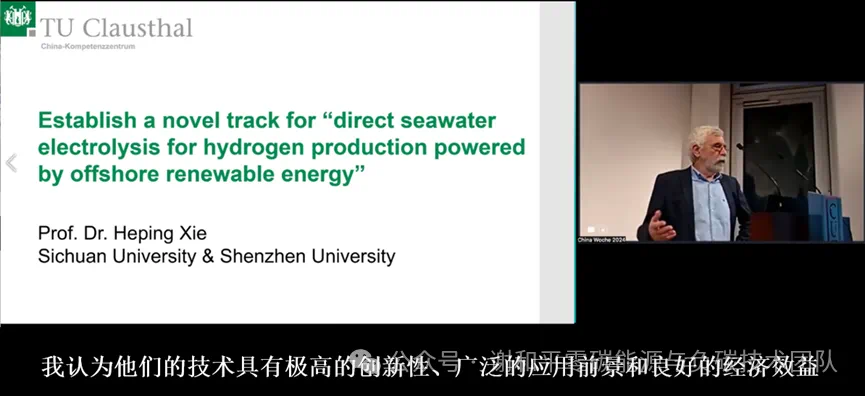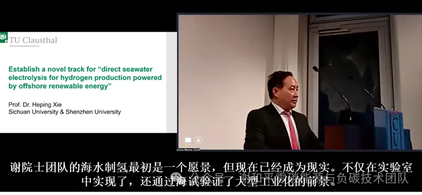 On November 14, 2024, Academician Xie Heping, a member of the Chinese Academy of Engineering and Director of the Institute of Deep Earth Sciences and Green Energy at Shenzhen University, was invited to deliver a keynote speech at the China-Europe Workshop on Hydrogen Energy, part of the "China Week" event held at the Clausthal University of Technology in Germany. Xie's presentation was titled "Establish a Novel Track for 'Direct Seawater Electrolysis for Hydrogen Production Powered by Offshore Renewable Energy'". Professor Schade from Clausthal University highly praised Xie's presentation, highlighting the innovative nature, vast potential, and promising economic benefits of the proposed technology for direct seawater electrolysis for hydrogen production powered by offshore renewable energy. Schade also expressed interest in collaborating with Xie's team on advanced hydrogen storage and monitoring technologies to jointly promote the research and commercialization of the entire hydrogen energy supply chain.