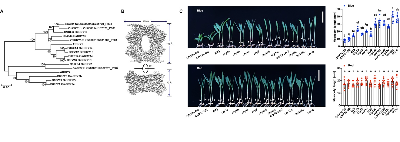 A. Phylogenetic analysis of CRYs; B. Structure of ZmCRY1c-PHR; C. Involvement of ZmCRYs in blue light signaling for photomorphogenesis
